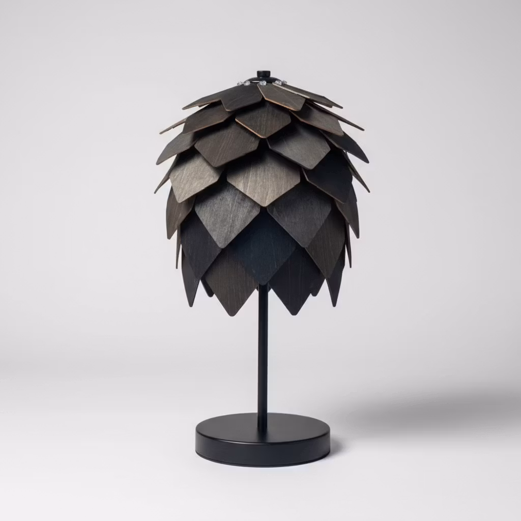 Denna underbara lampa är gjord av trälameller med en form som kan liknas med en kotte, vi har döpt den till skogsgläntan då ljuset skimrar ut fint vid lamellerna likt en skogsglänta.