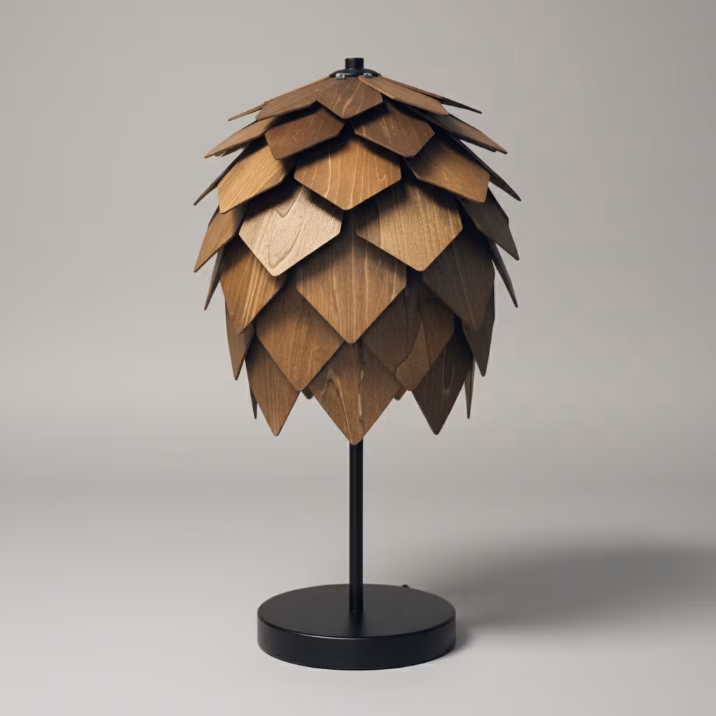 Denna underbara lampa är gjord av trälameller med en form som kan liknas med en kotte, vi har döpt den till skogsgläntan då ljuset skimrar ut fint vid lamellerna likt en skogsglänta.