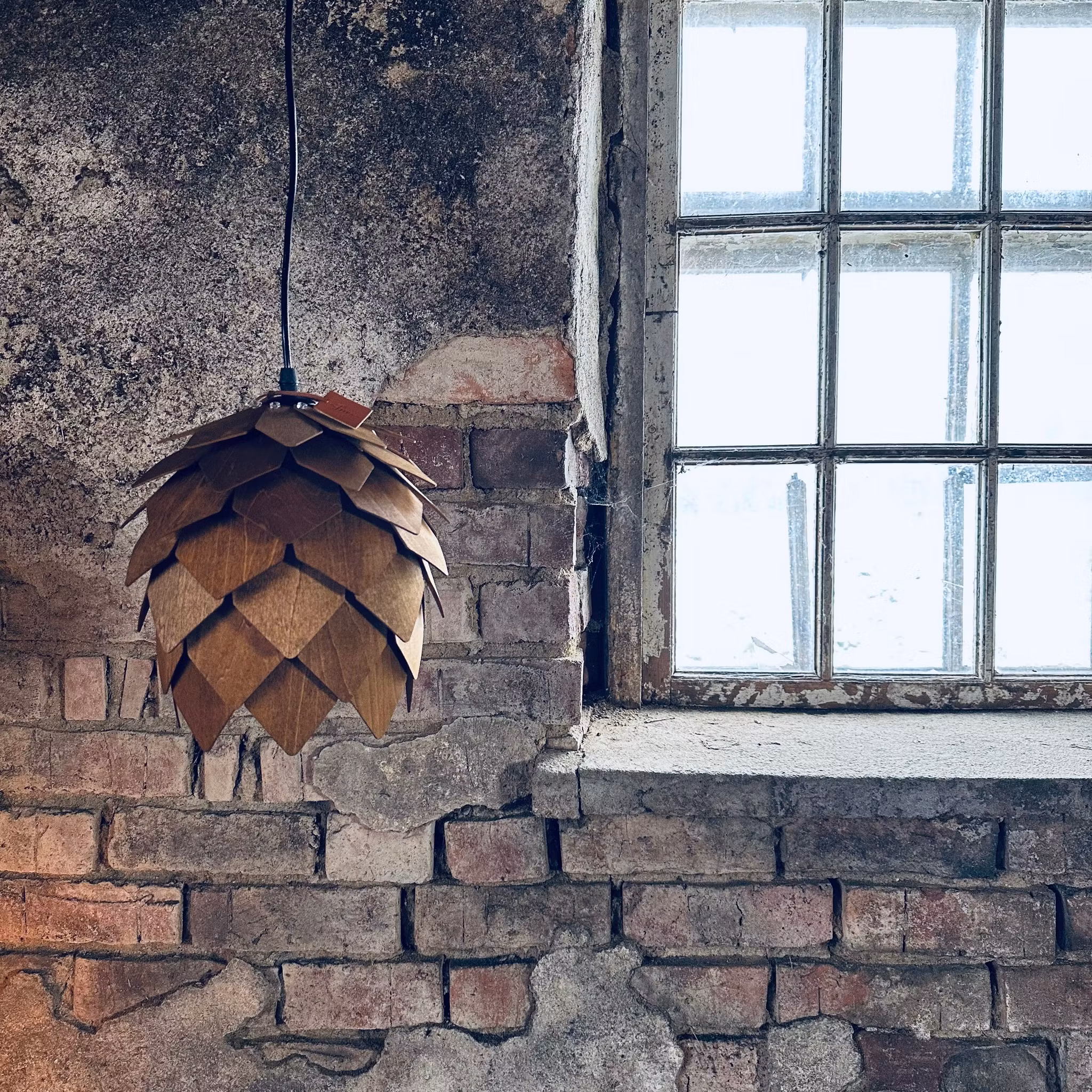 Denna underbara lampa är gjord av trälameller med en form som kan liknas med en kotte, vi har döpt den till skogsgläntan då ljuset skimrar ut fint vid lamellerna likt en skogsglänta.