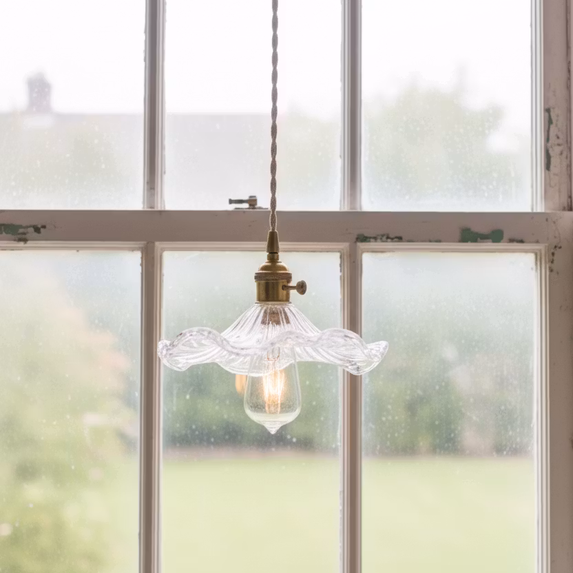 Fönsterlampan Blomvåg bjuder på mjuka, organiska former och ett uttryck som känns både stillsamt och levande. Den vågiga skärmen i klart glas fångar och reflekterar ljuset likt dagg på blomblad, vilket skapar ett vackert och behagligt sken i rummet.