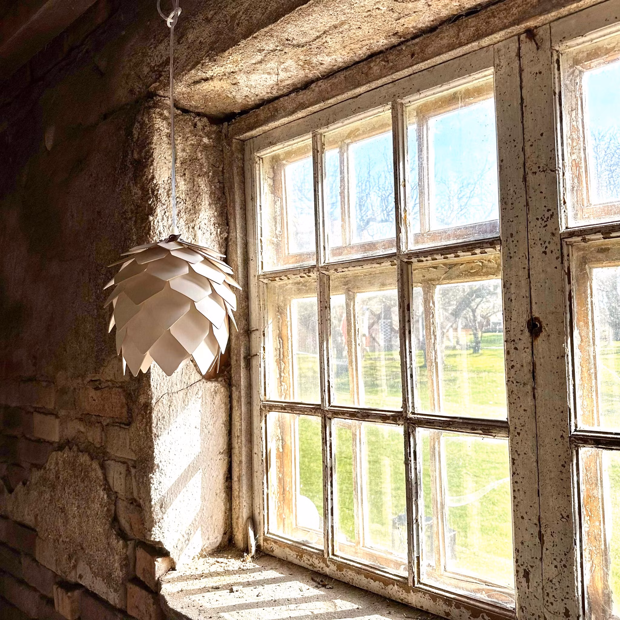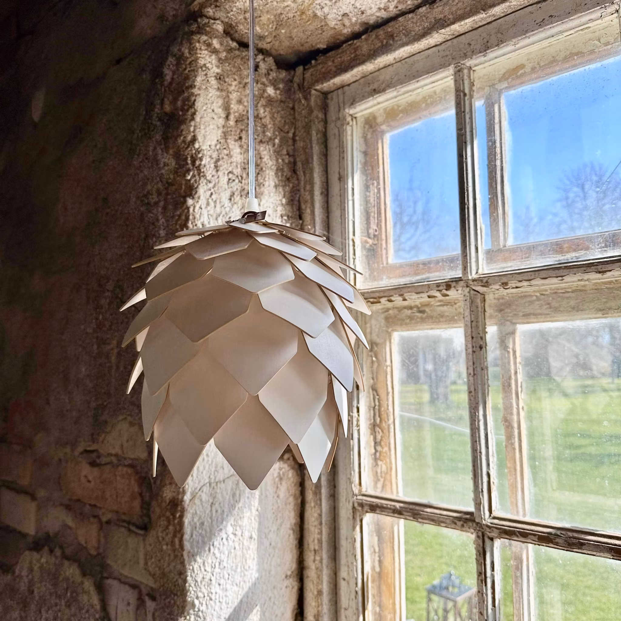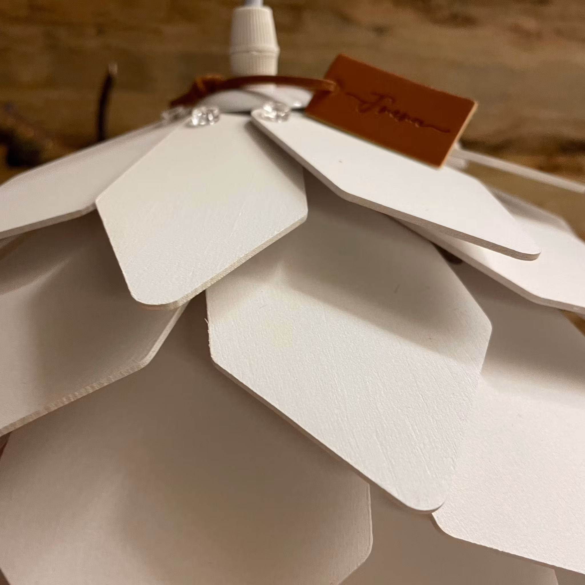 Denna underbara lampa är gjord av trälameller med en form som kan liknas med en kotte, vi har döpt den till skogsgläntan då ljuset skimrar ut fint vid lamellerna likt en skogsglänta.