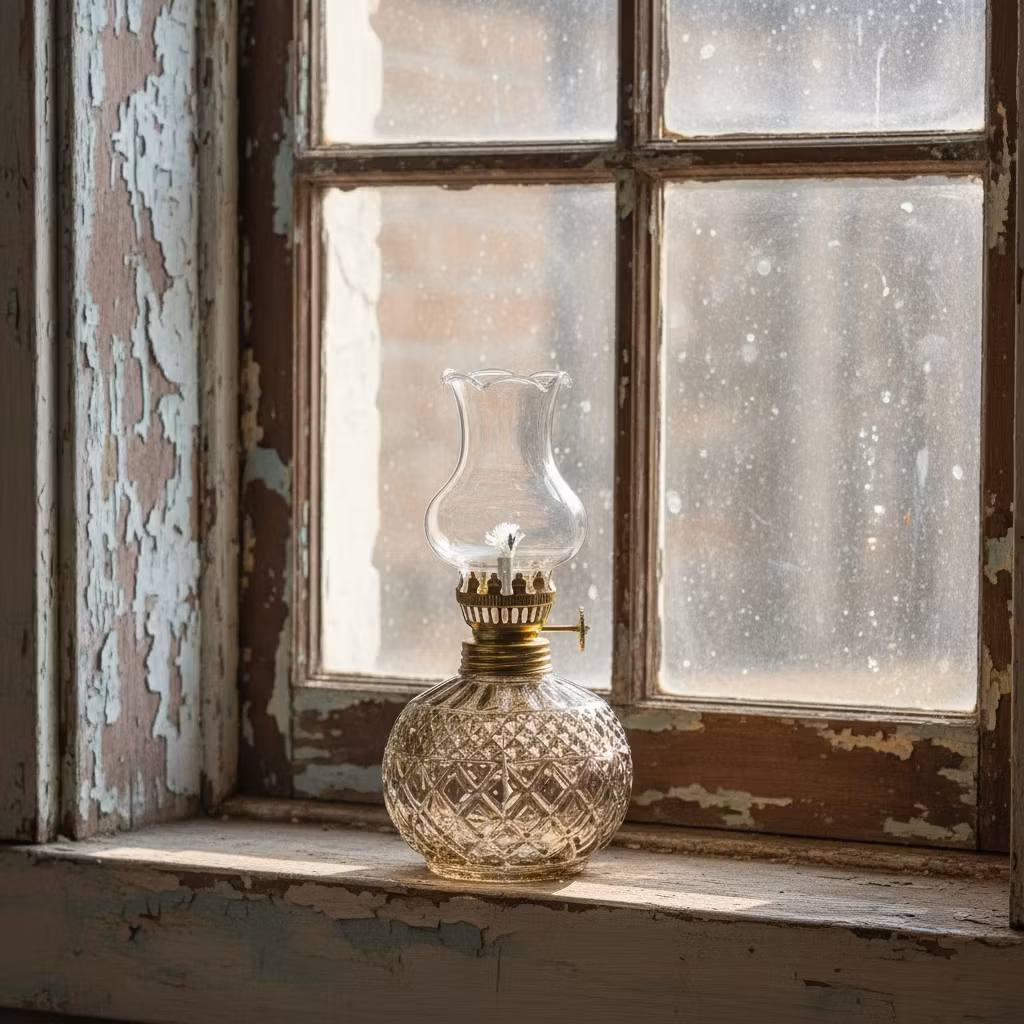 En alldeles bedårande fotogenlampa i glas med vackra detaljer.