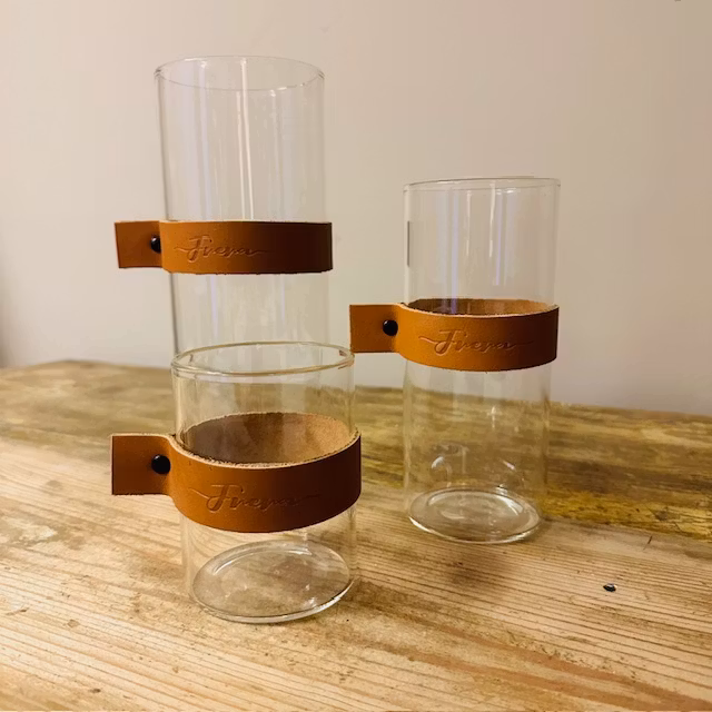 Frera Designs glas set är tillverkat i högklassigt glas med en vacker läderrem som bryter av snyggt med den stilrena designen.