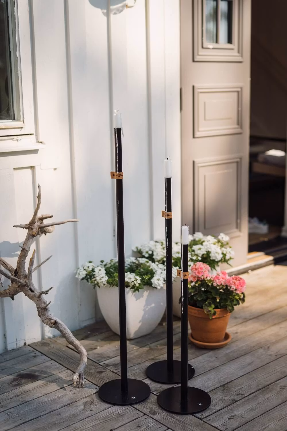 Snygg och stilren golvljusstake 80cm hög i färgen svart halvmatt med brunt läderband som bryter av, den har även en fin matta undertill som skyddar golvet, egendesignad och egentillverkad i Närke av Frera Design i samarbete med lokala företag.
