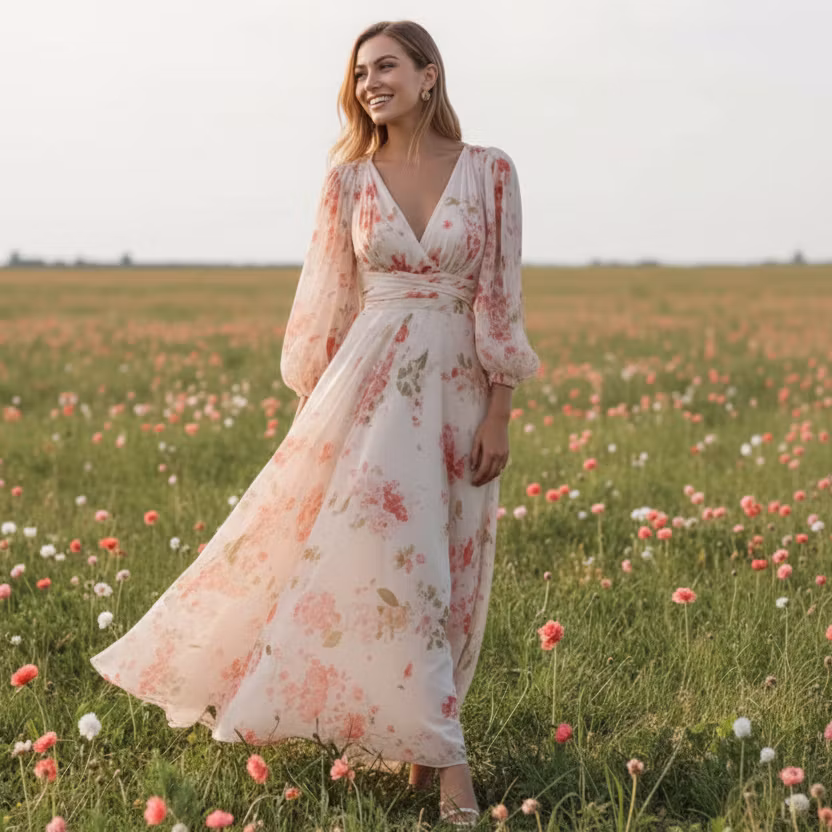 Upptäck den vackra maxiklänningen Alva, ett feminint och elegant plagg med ett vackert blommönster.