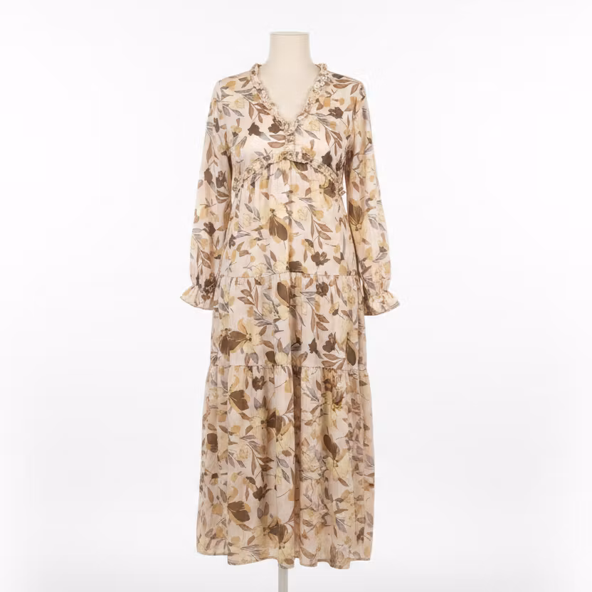 Klänning Rosalie är en romantisk och feminin klänning i mjuka beiga toner med ett vackert blommönster.
