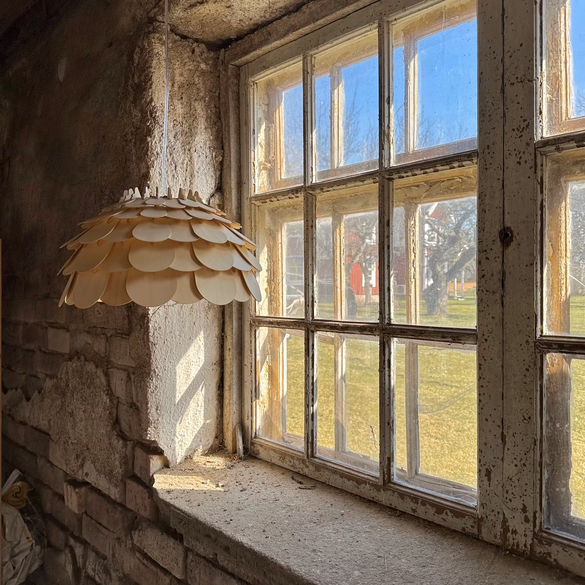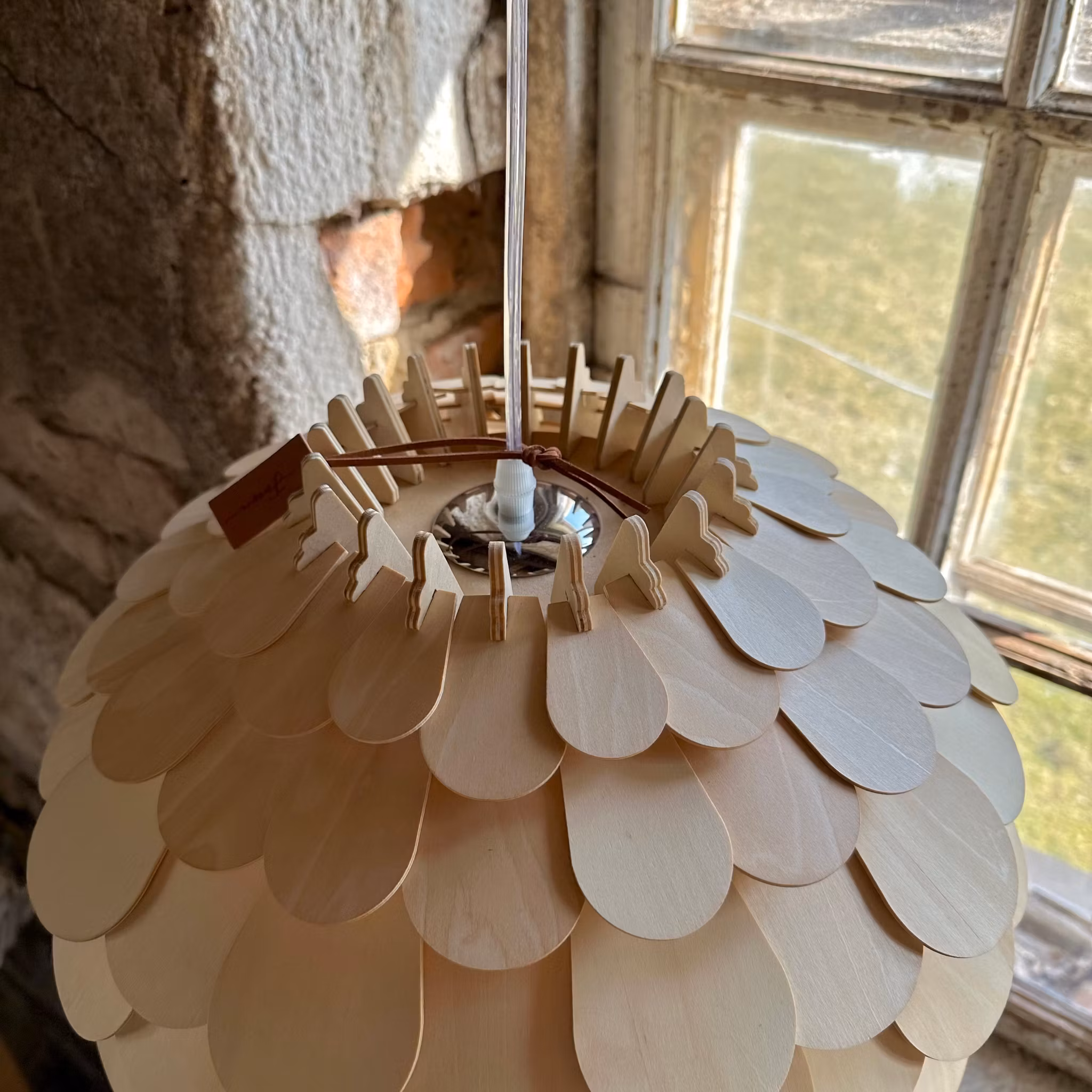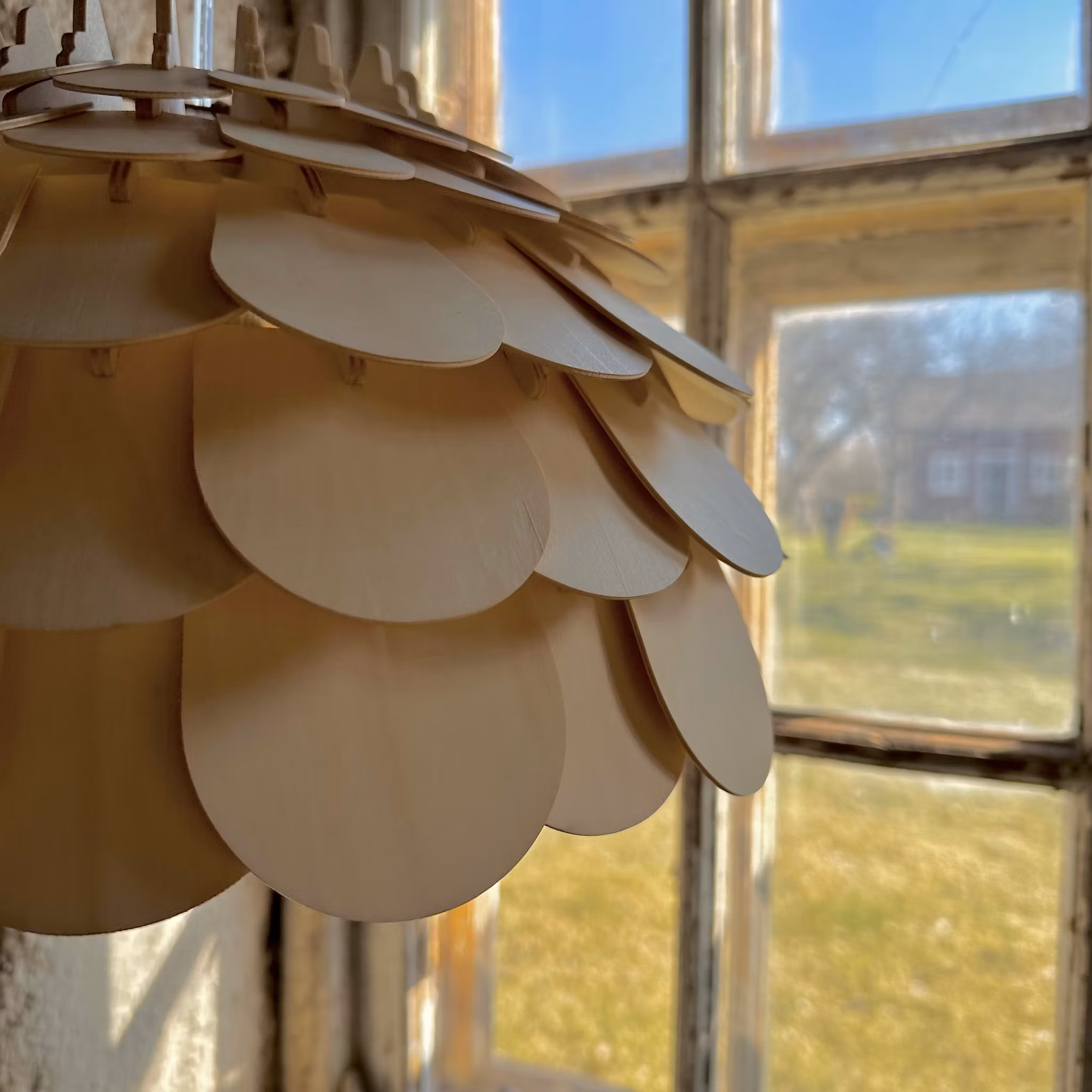 Denna underbara taklampa är gjord av träfanér med en form som påminner om en fin näckros.