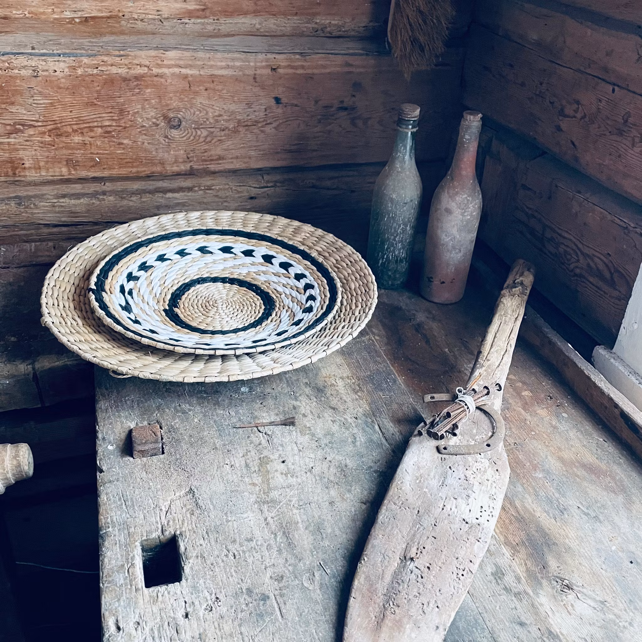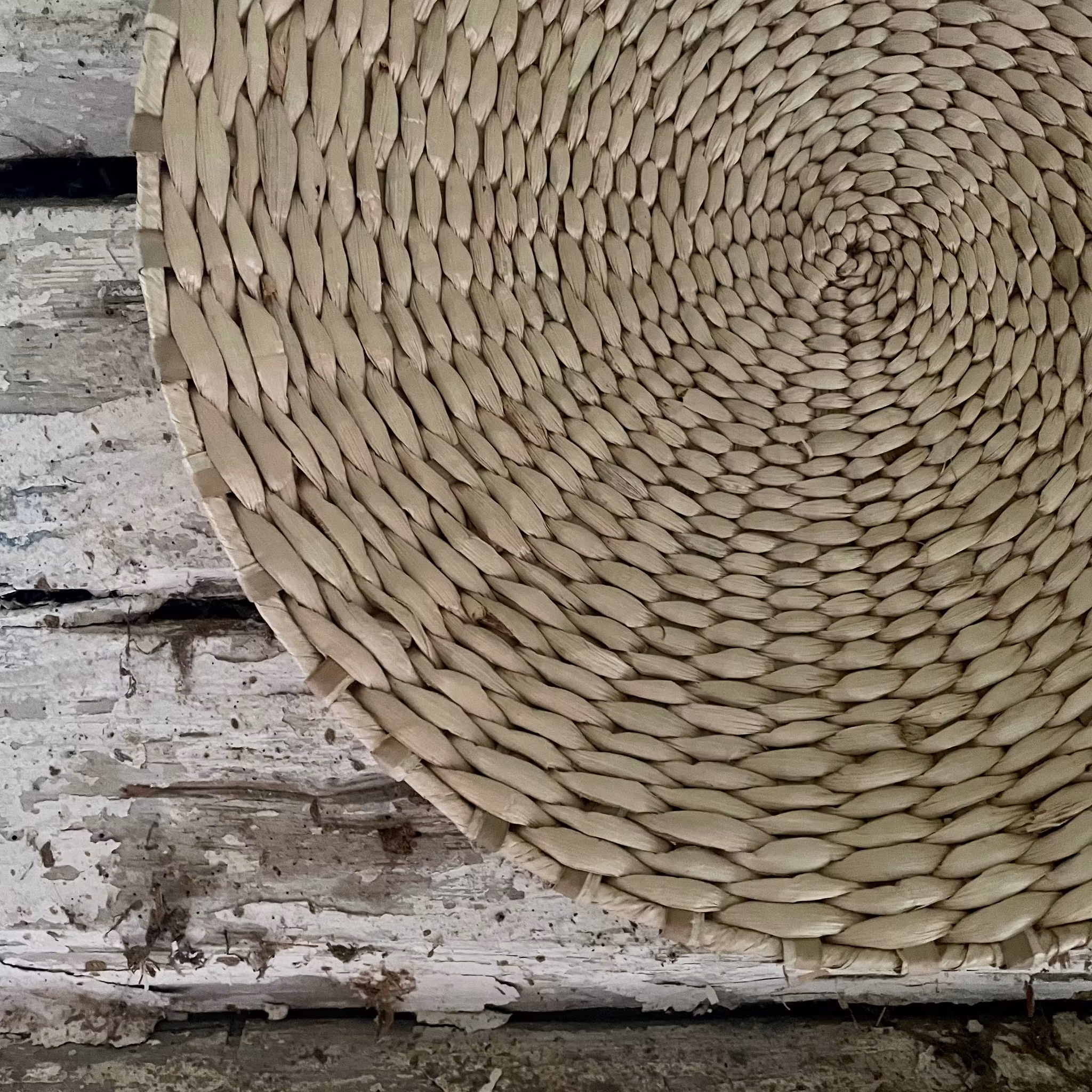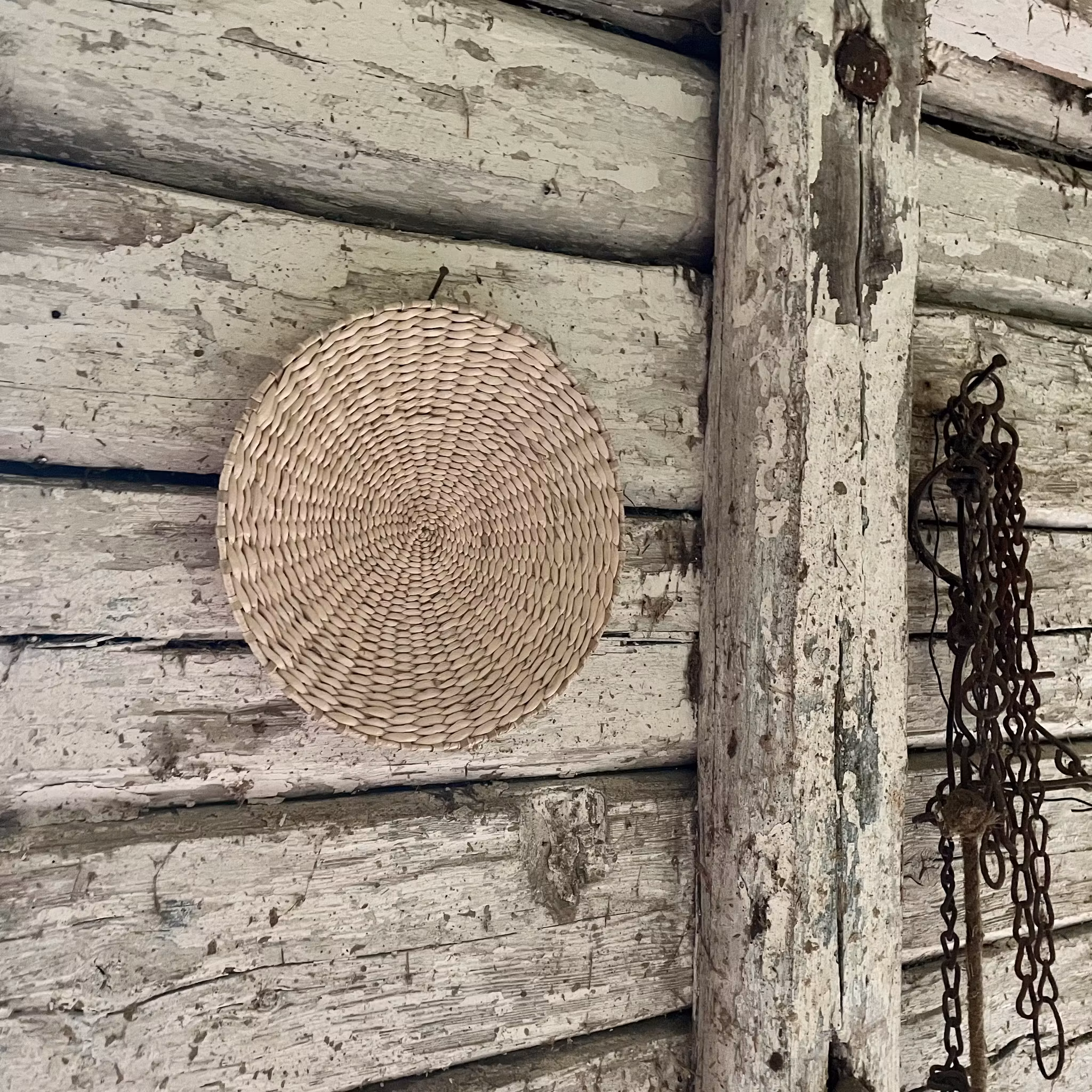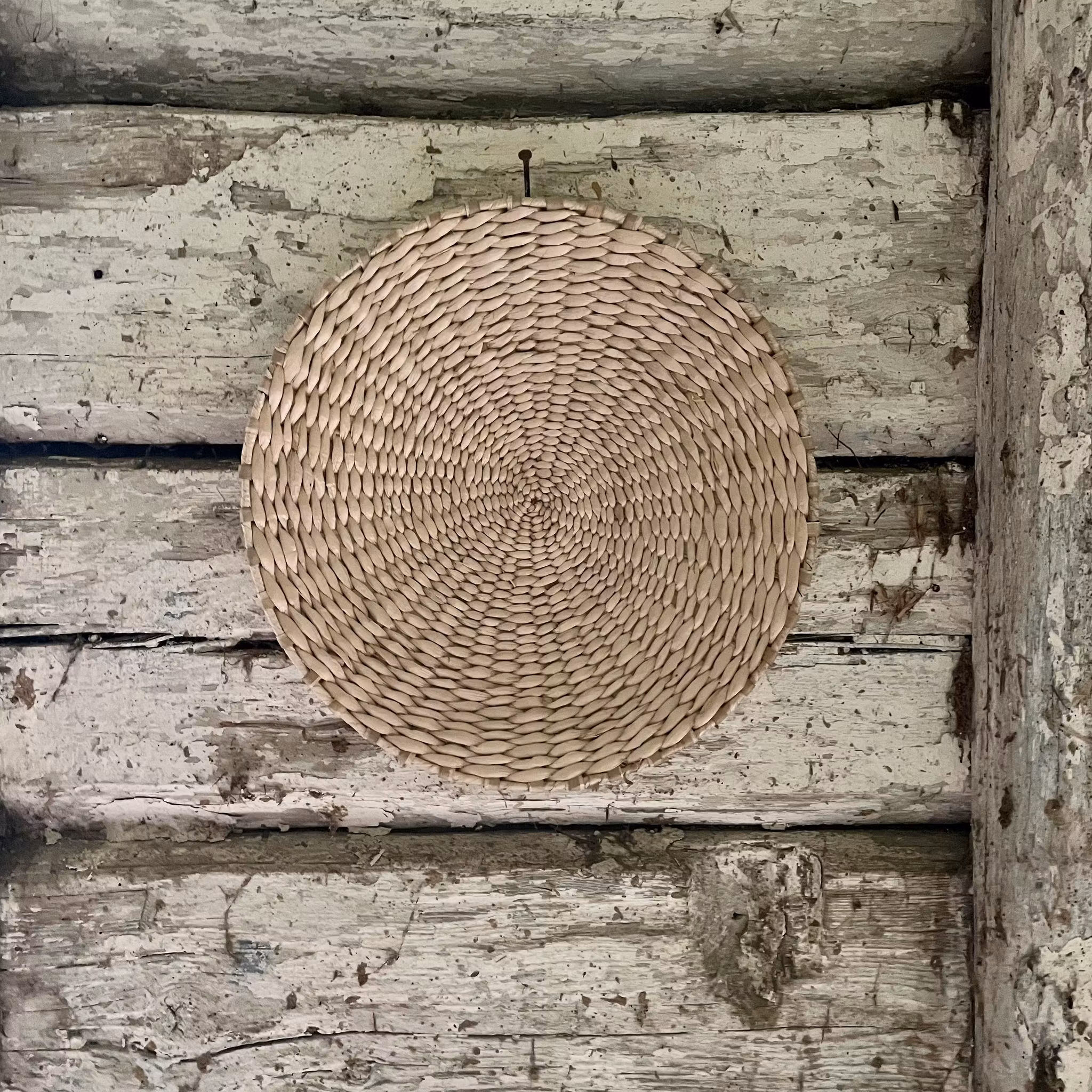 Vacker handgjord flätad väggdekor i naturliga färger.