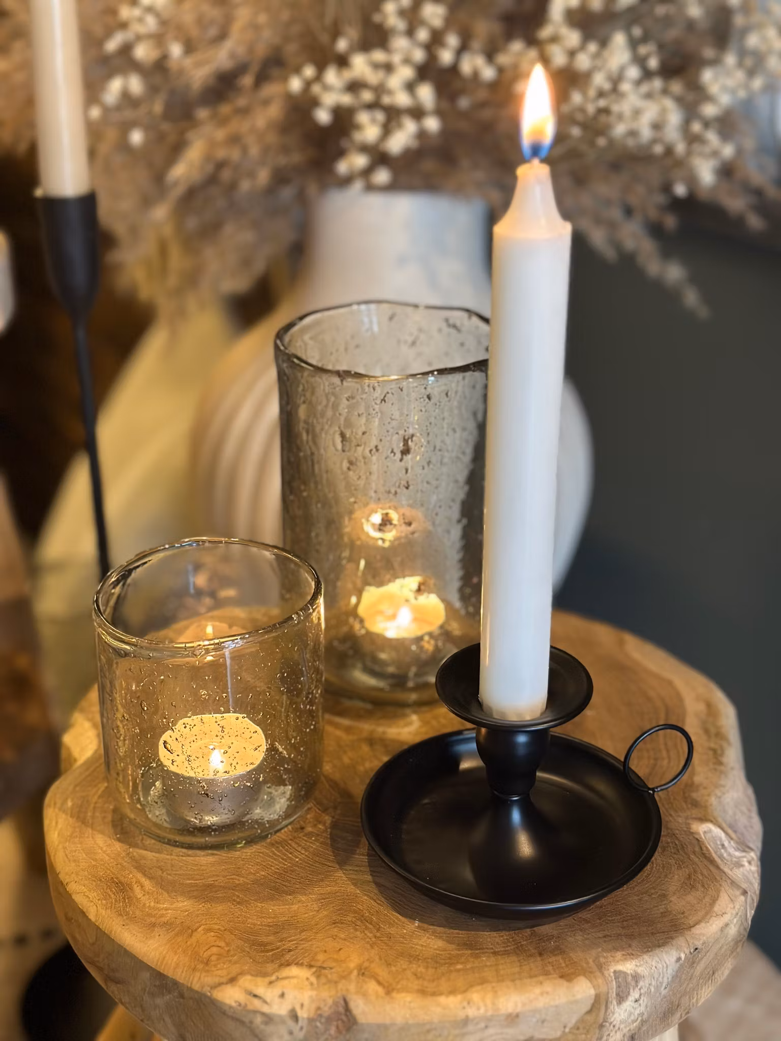 Ljusstaken har ett smidigt handtag på ena sidan, vilket ger den en klassisk och lantlig karaktär, samtidigt som det gör den enkel att bära och flytta. Runt själva ljushållaren löper en mjukt formad, grund skål som kan fyllas med små naturskatter – exempelvis mossa, kottar, torkade blommor eller stenar – för att skapa en personlig och säsongsbetonad dekoration.