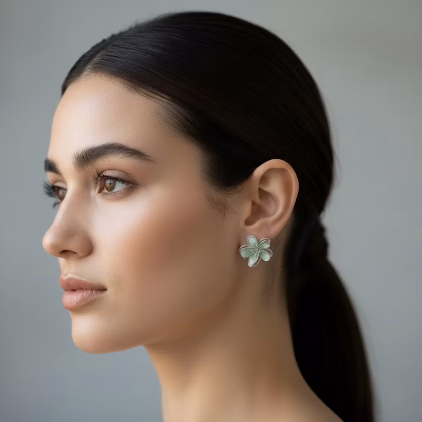 Lyft din stil med Flower Green Shimmer – ett par vackra blomörhängen med gröna nyanser med en subtil skimrande effekt som fångar ljuset på ett elegant sätt.
