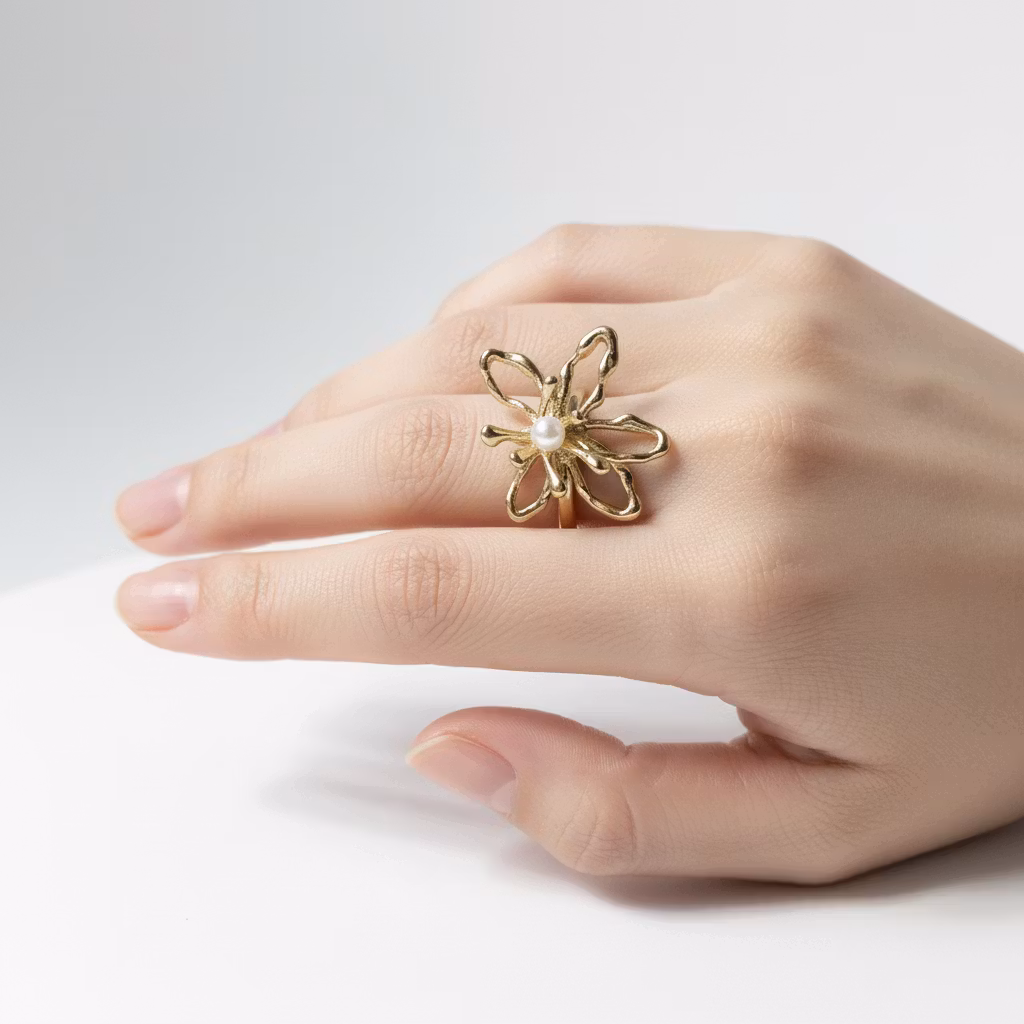 Upptäck Ring Celestia, en elegant och feminin ring i guldfärgad blomform med en vacker vit pärla i mitten. Den detaljrika designen kombinerar romantisk blomstruktur med en klassisk pärldetalj, vilket skapar ett sofistikerat och tidlöst uttryck.