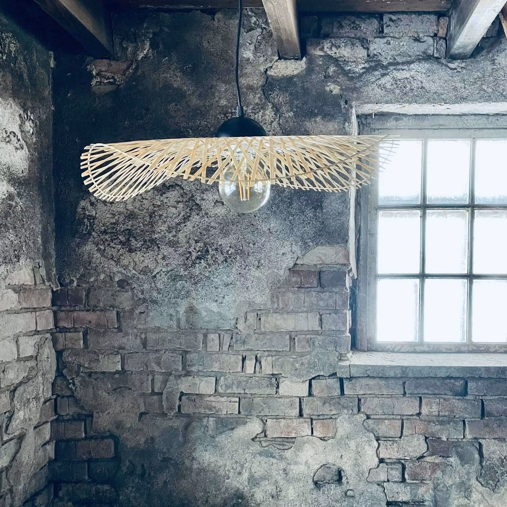 Denna underbara taklampa är gjord av flätad bambu med en form som vi känner kan liknas ett böljande norrsken.