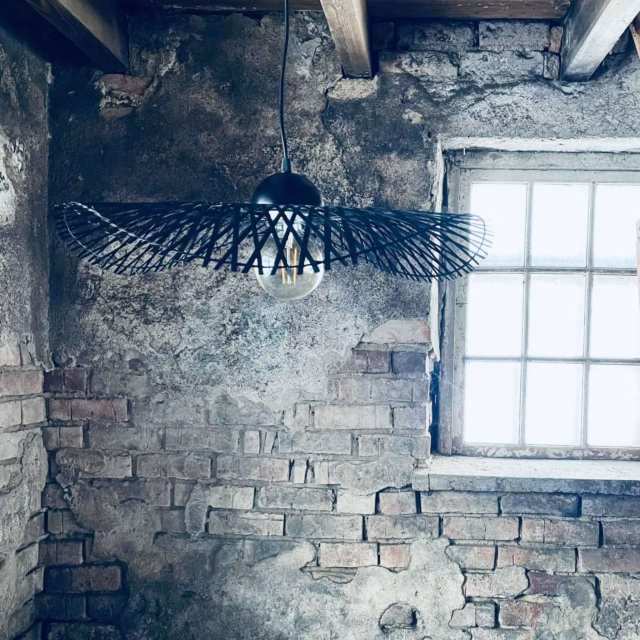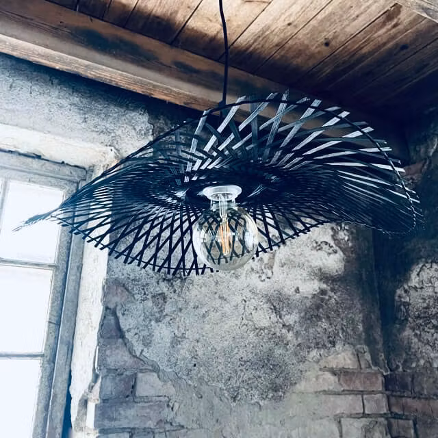 Denna underbara taklampa är gjord av flätad bambu med en form som vi känner kan liknas ett böljande norrsken.