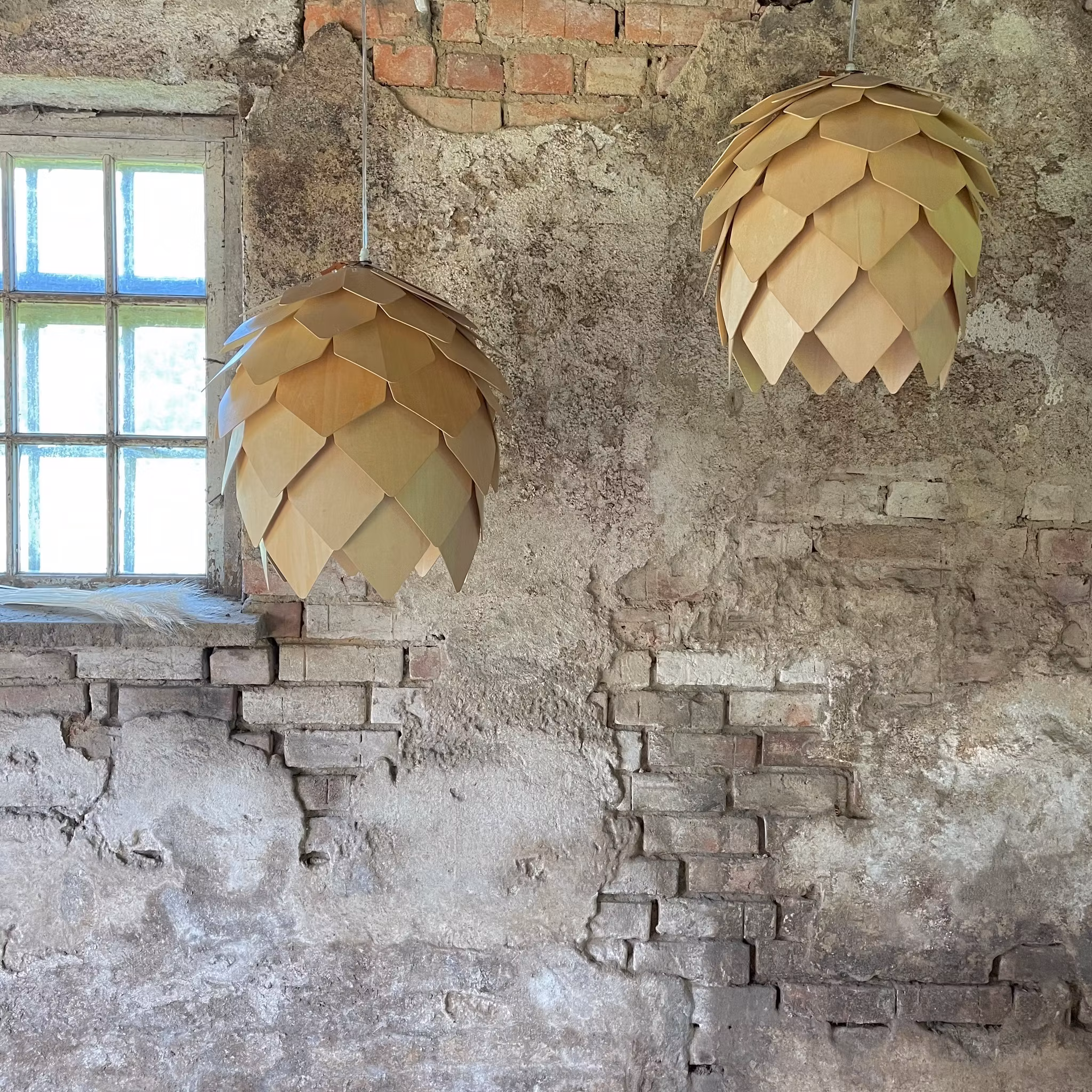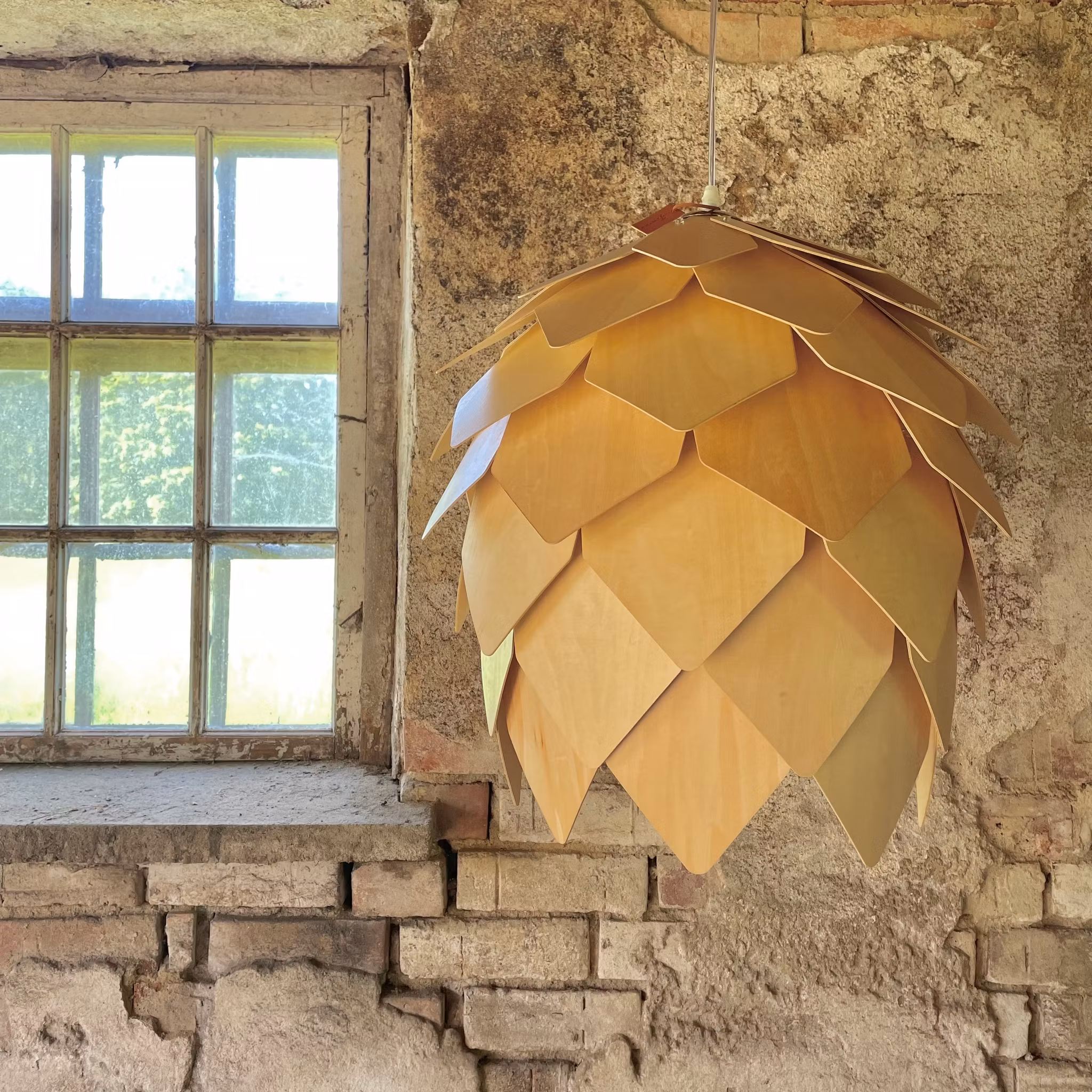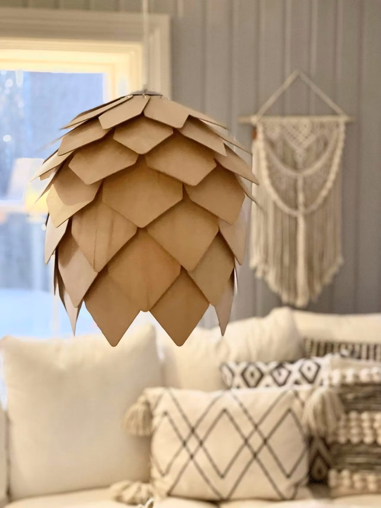 Denna underbara taklampa är gjord av trälameller med en form som kan liknas med en kotte, vi har döpt den till skogsgläntan då ljuset skimrar ut fint vid lamellerna likt en skogsglänta.