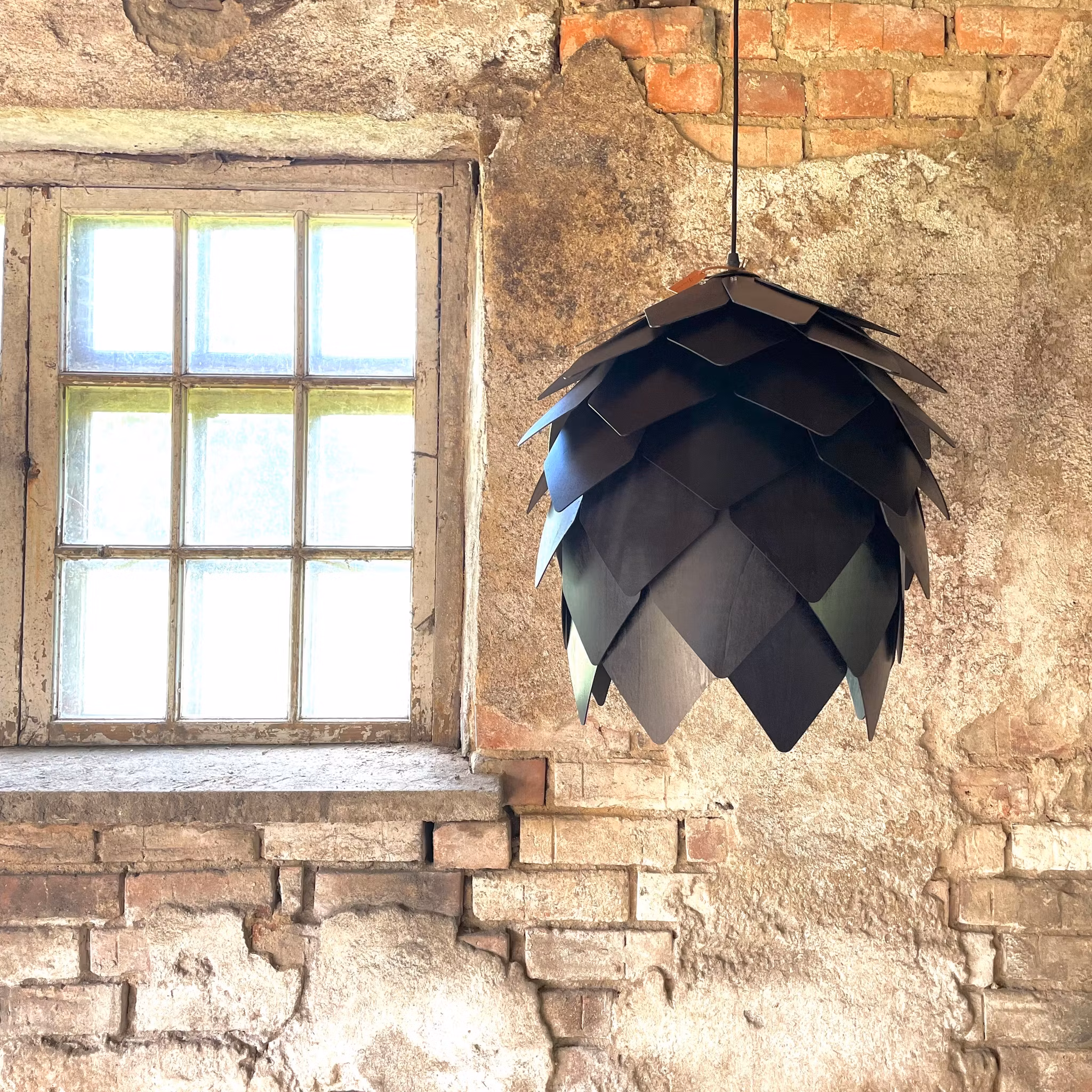Denna underbara taklampa är gjord av trälameller med en form som kan liknas med en kotte, vi har döpt den till skogsgläntan då ljuset skimrar ut fint vid lamellerna likt en skogsglänta.