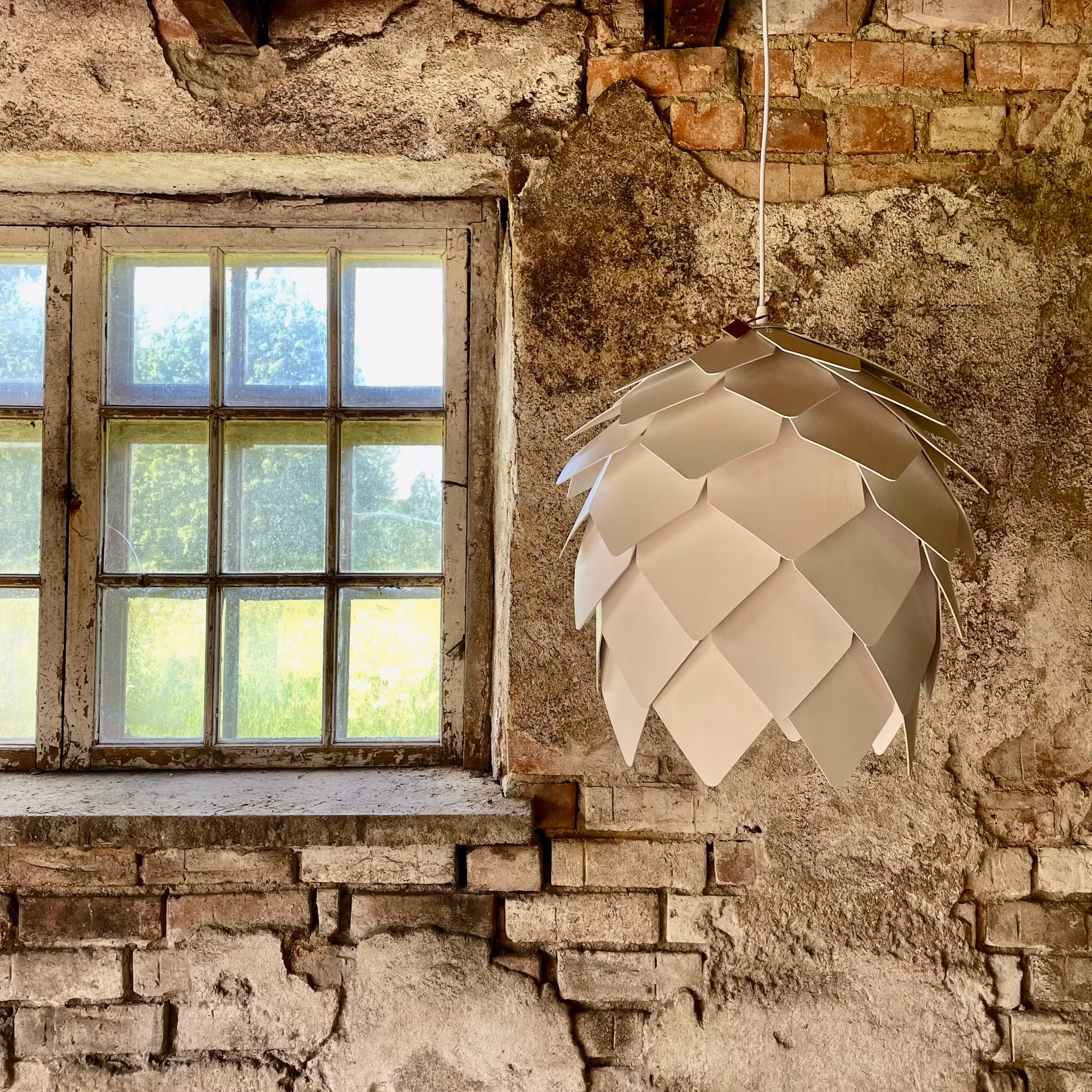 Denna underbara taklampa är gjord av trälameller med en form som kan liknas med en kotte, vi har döpt den till skogsgläntan då ljuset skimrar ut fint vid lamellerna likt en skogsglänta.