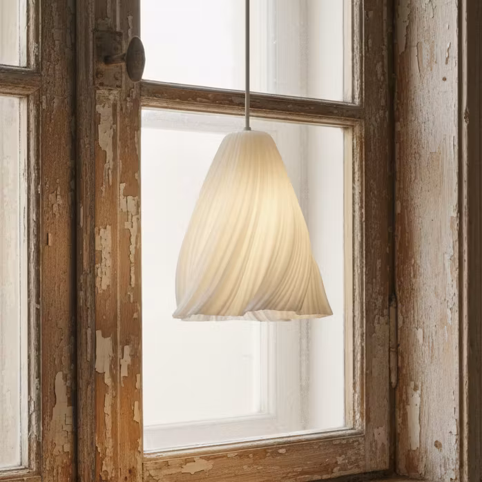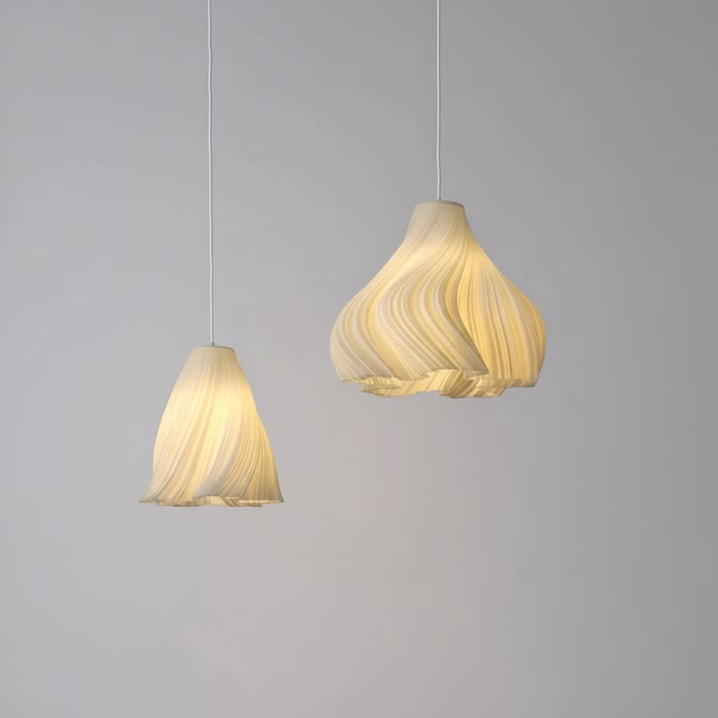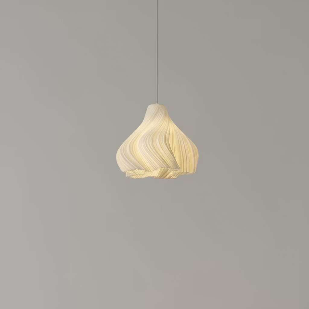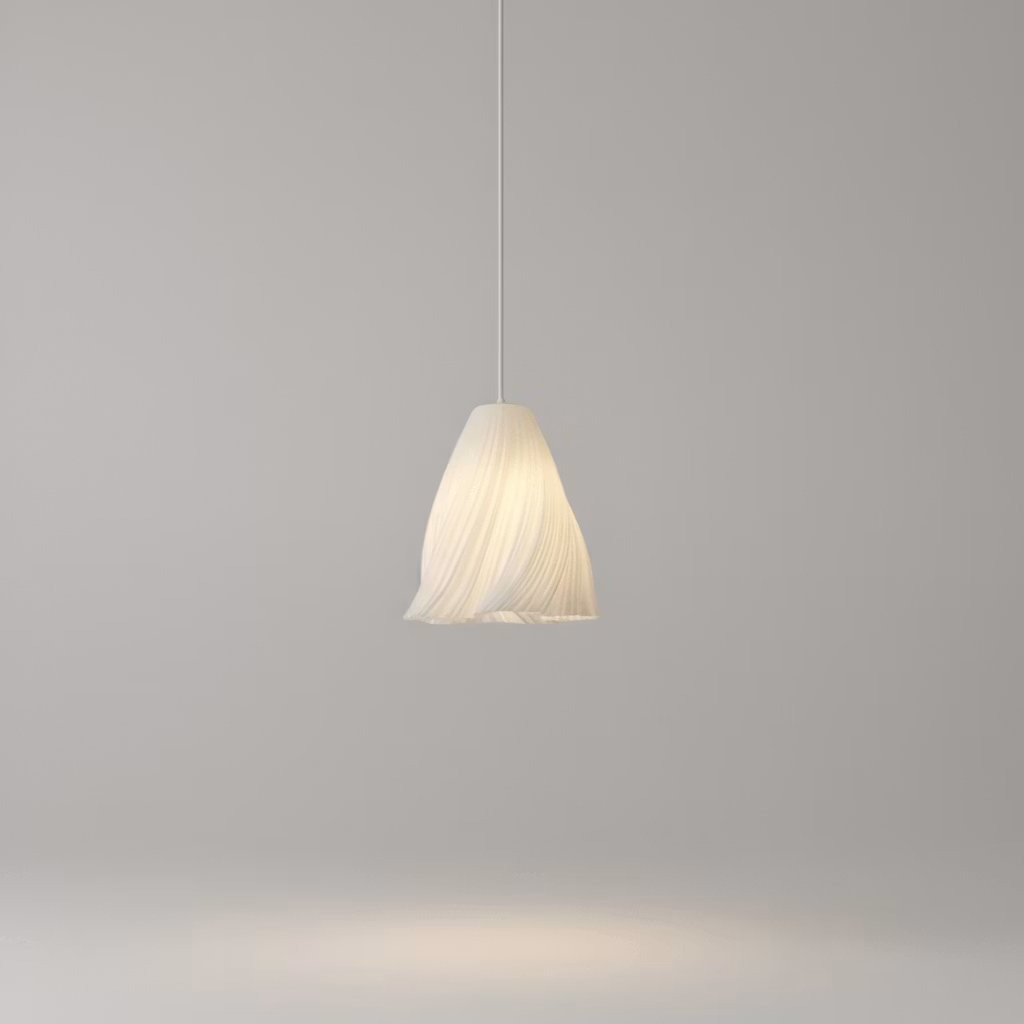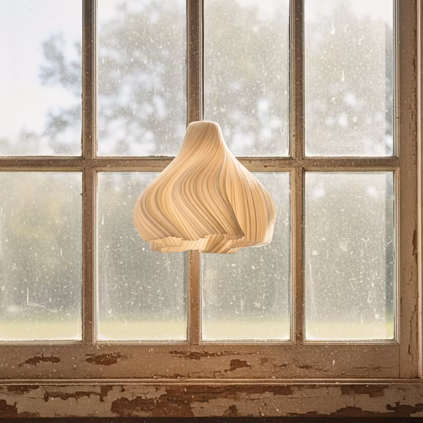Ljuset silas genom de mjuka böjarna, vilket skapar ett levande skuggspel på väggar och tak. Vinda ger en känsla av rörelse även när den är stilla – som en frusen vindpust eller en sakta virvlande ström.